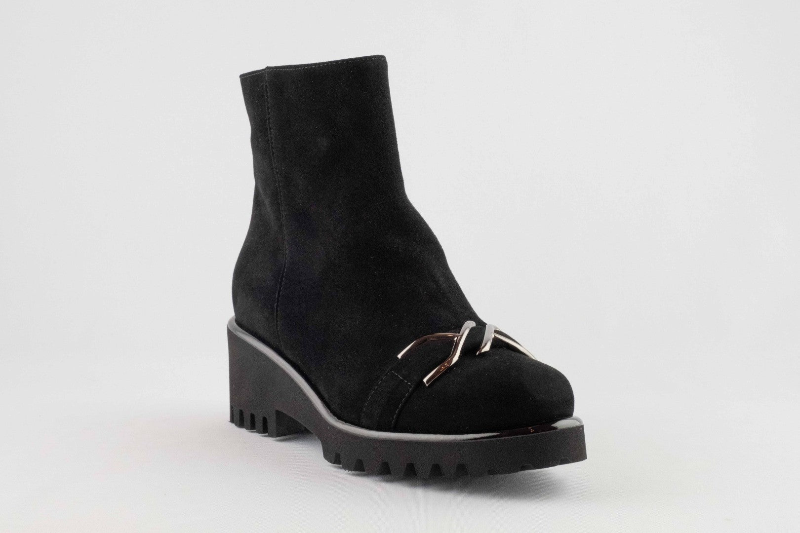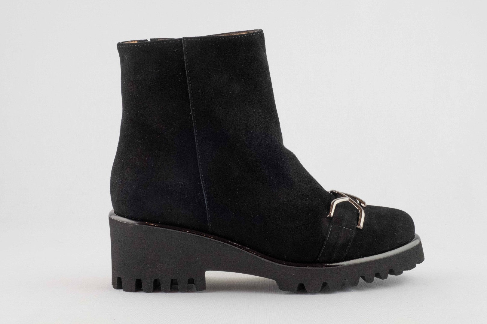 Kelton ankle boot in black suede with chunky sole, nickel detail and zip on side for easy access