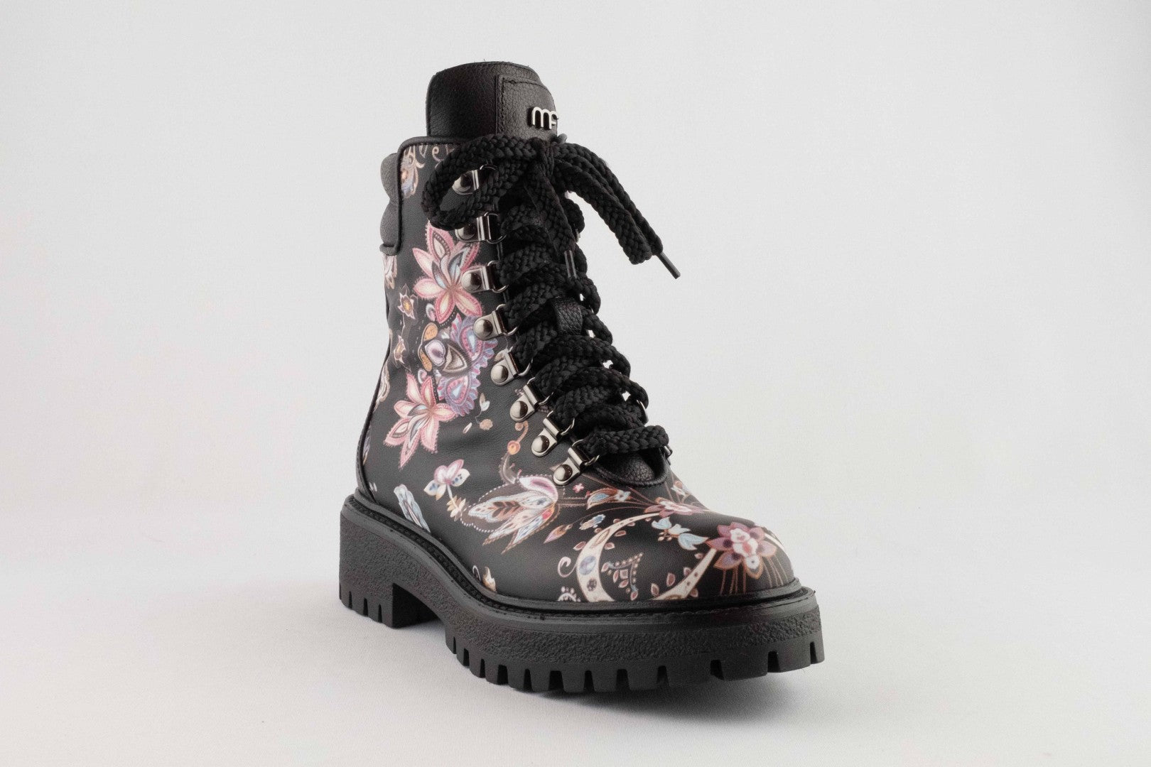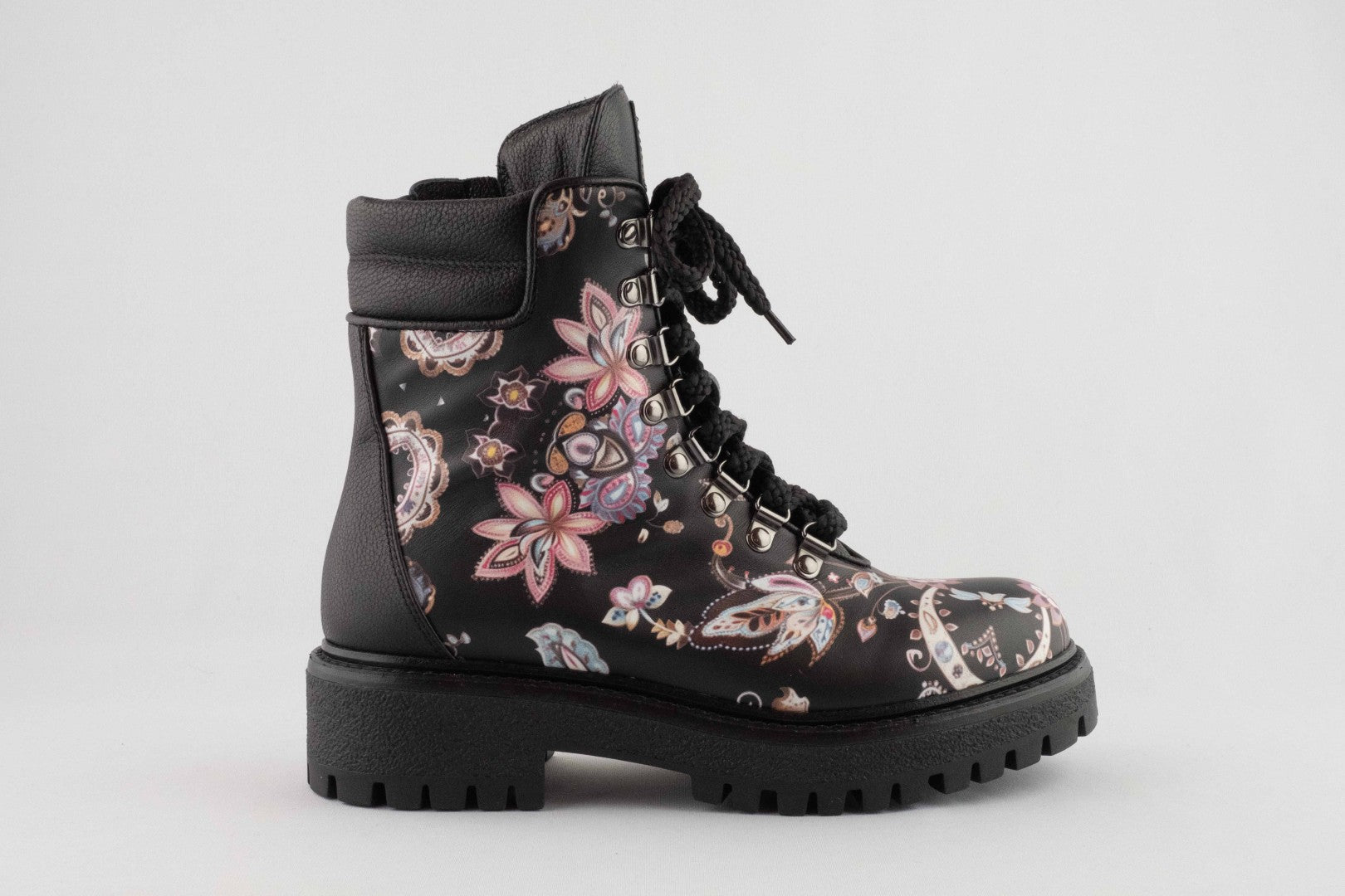 Thick lace and floral design leather accent add a rock edge to our exclusive black calfskin combat boots. Crafted in Italy, they feature a rounded toe, side zip closure, and chunky rubber lug sole. Make them the centerpiece of your new casual yet bold outfits.