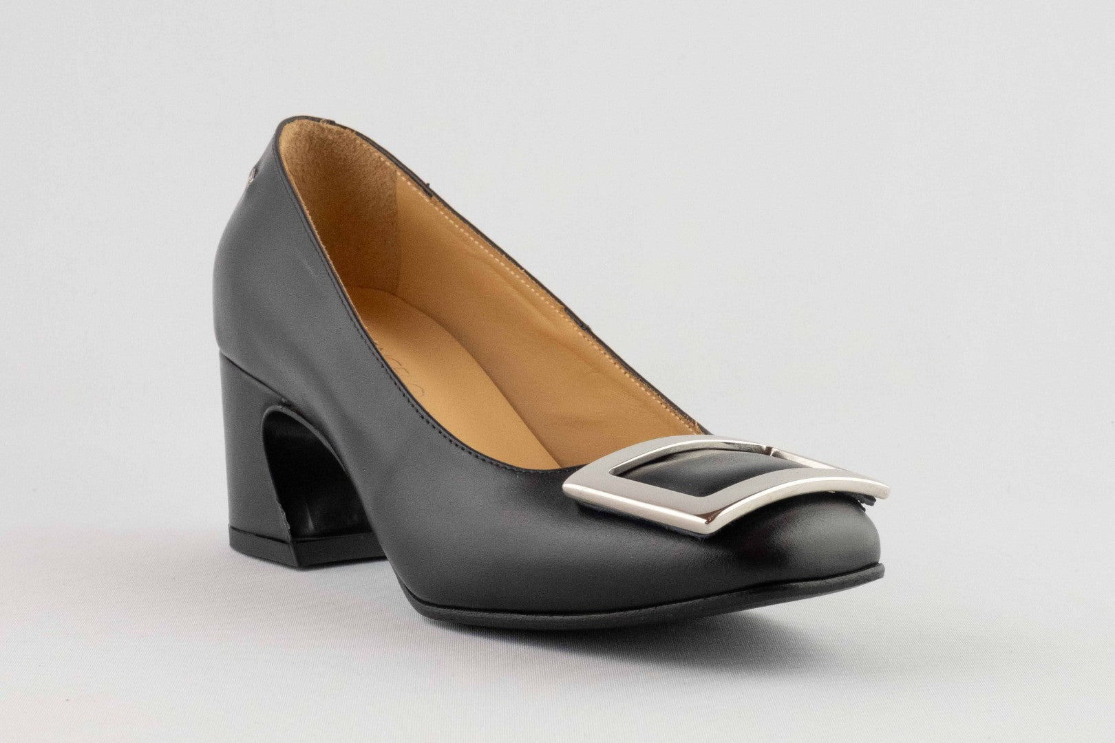Crafted in Italy from premium black calfskin leather with silver accent perfectly combine elegance and comfort. They sit on a block midi heel and reveal a rounded toe. Wear them with a pencil skirt and a tailored shirt.