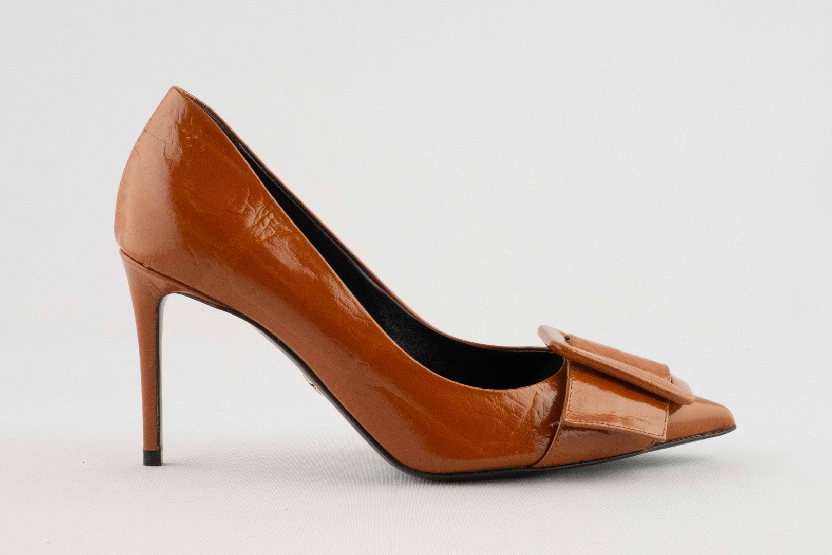Quintessence of femininity, a pair of pumps can never be missing in our wardrobe. This new style in premium tobacco patent leather reveals a pointed toe silhouette, a comfortable stiletto heel and our iconic leather outsole. Perfect to wear both day and night.