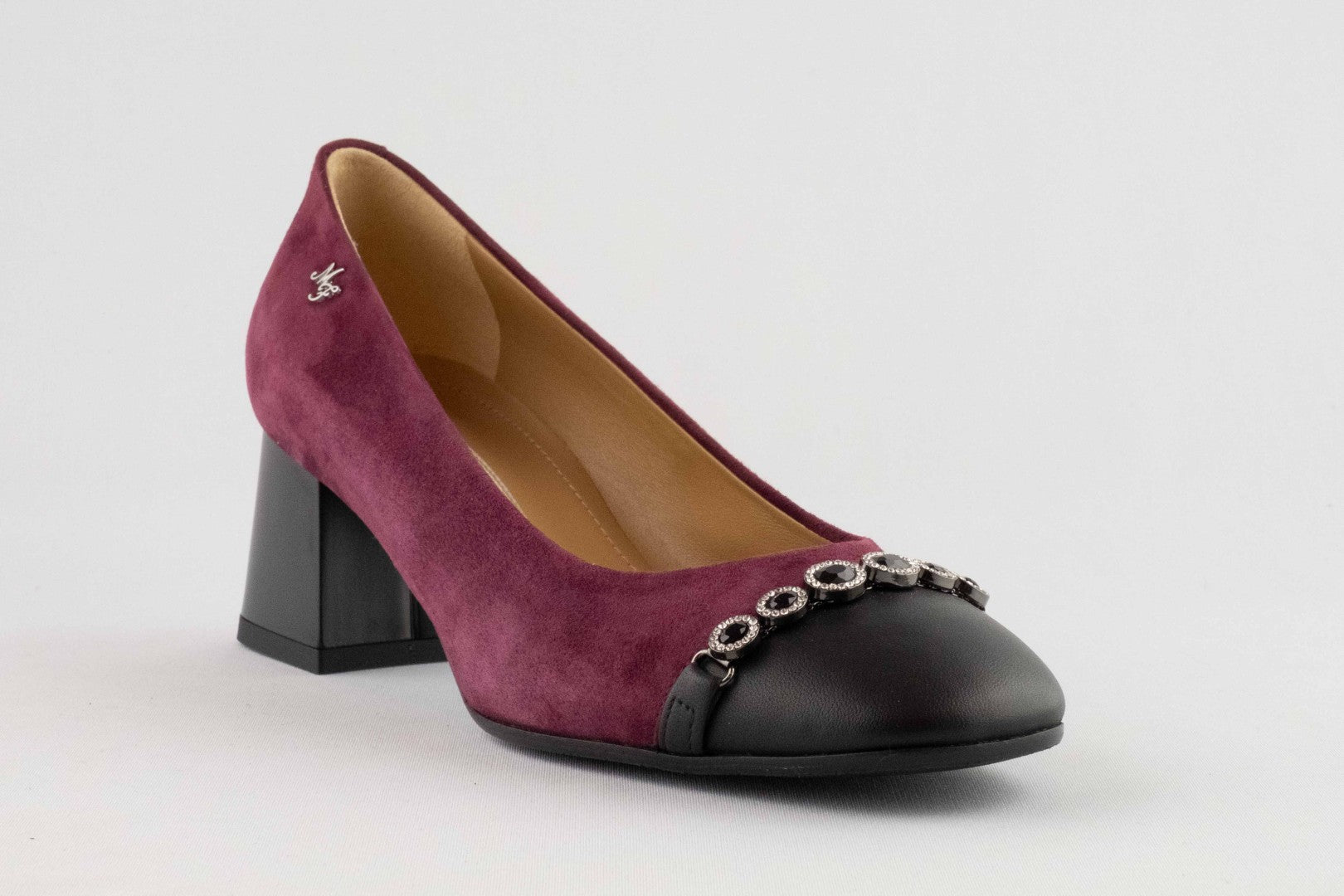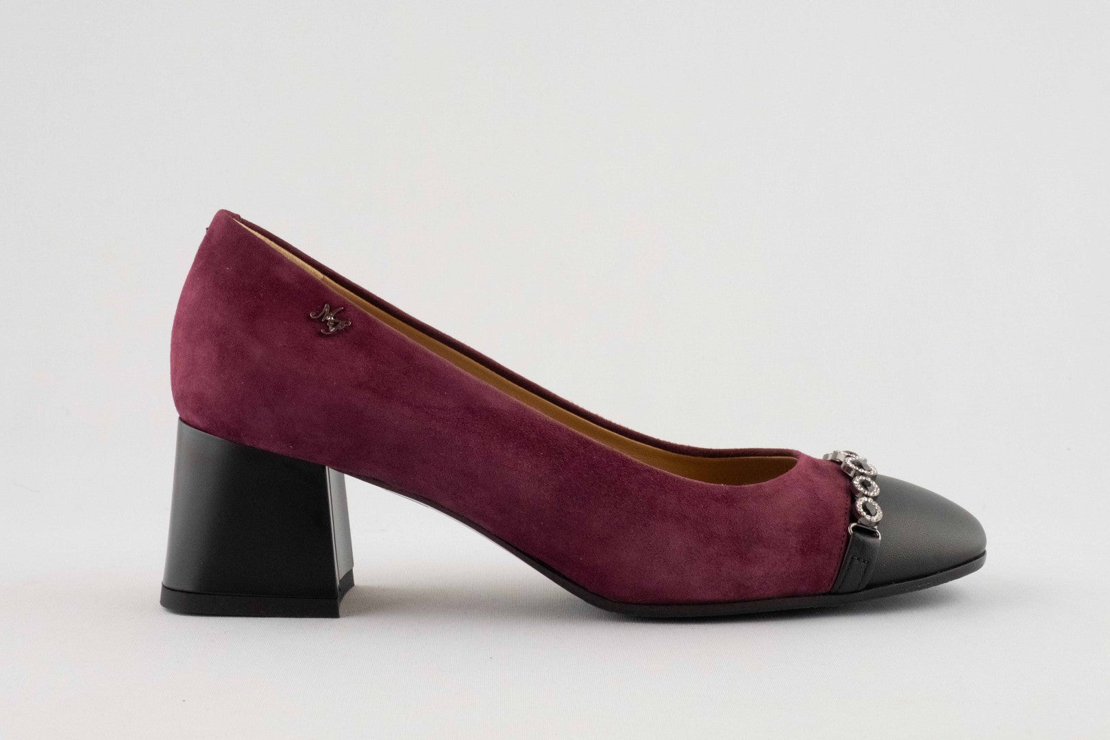 Crafted in Italy from premium wine suede leather with black leather accent on toe, our pumps perfectly combine elegance and comfort. They sit on a block 2 inch heel and reveal a low-cut silhouette with a rounded toe. Wear them with a pencil skirt and a tailored shirt.