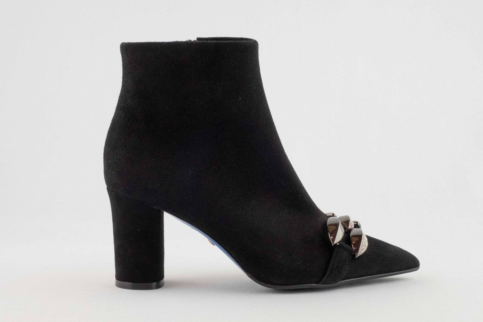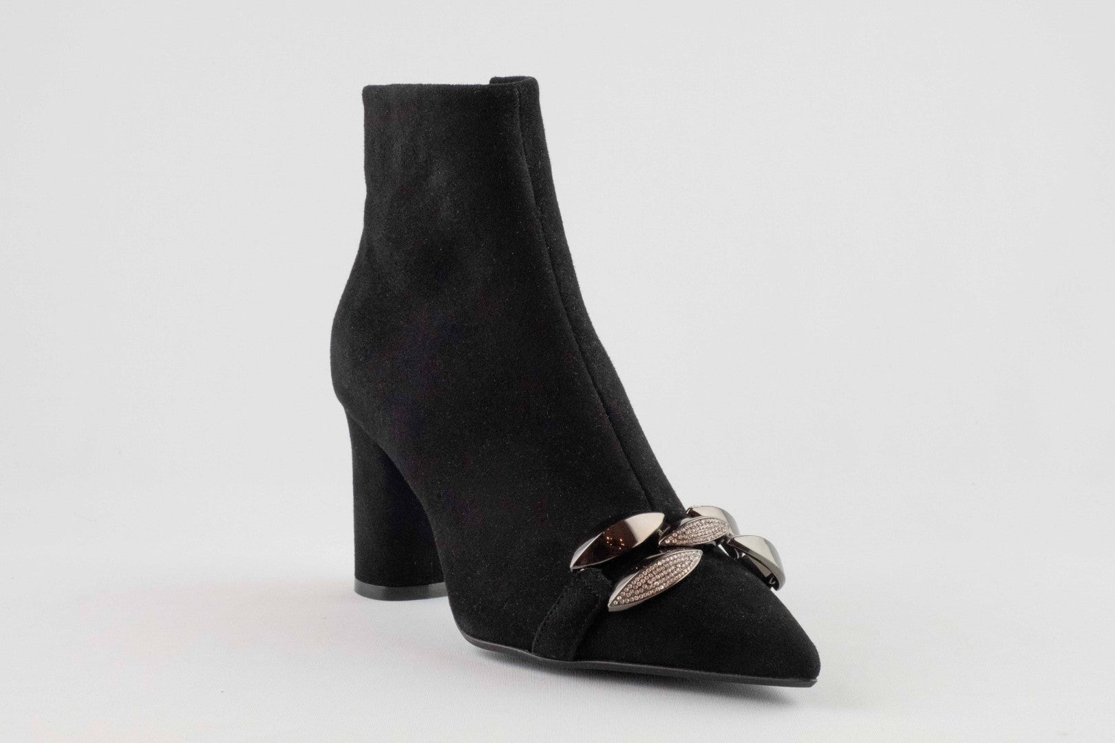 Our all-black ankle boots from the new collection feature a tapered and decidedly feminine silhouette. Crafted in Italy from premium black suede, they feature a sophisticated front accessory with matching stone settings and an internal zip closure. Our comfortable stiletto heel completes their elegant design.